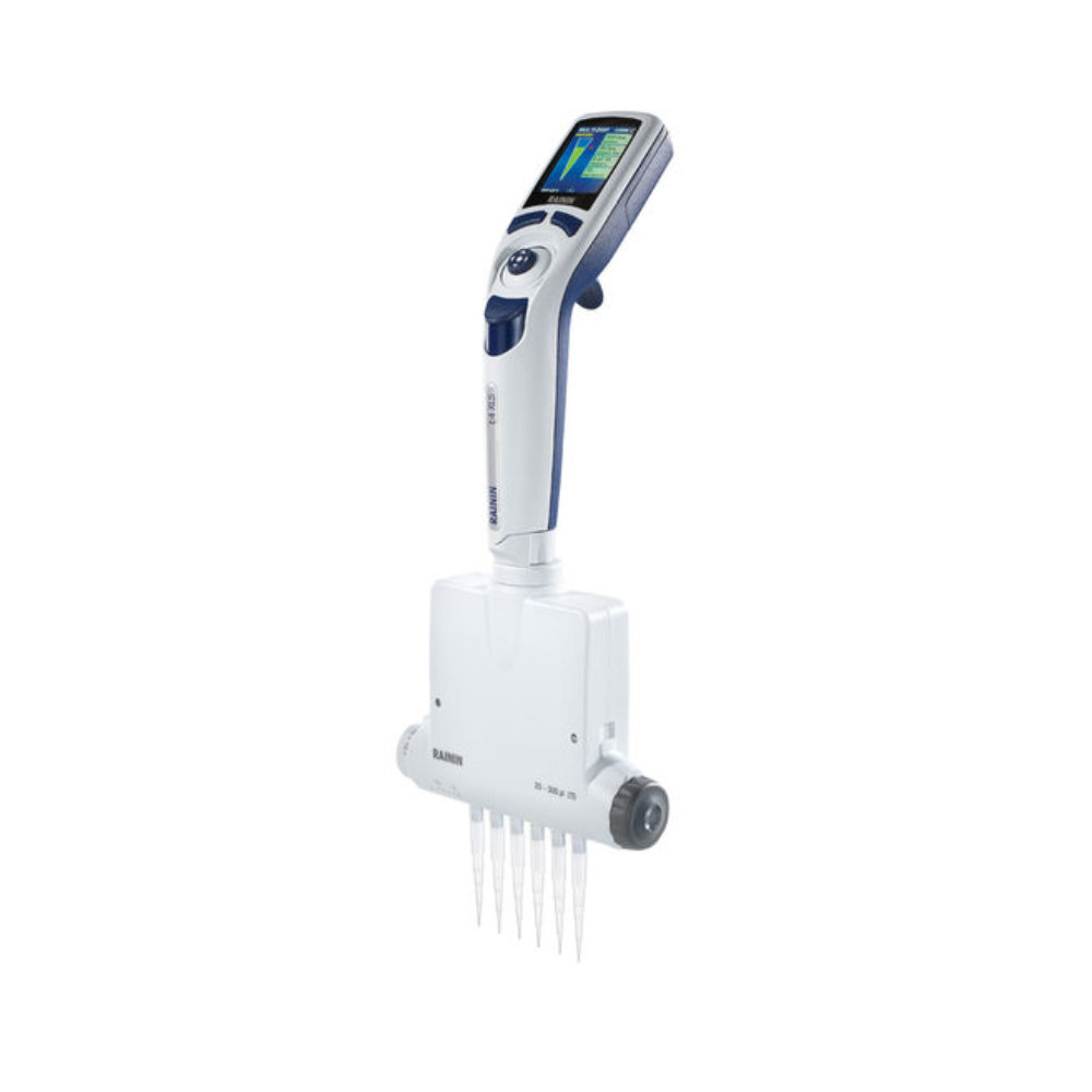 Za rad s visokim protokom koji uključuje više formata, ništa ne može nadmašiti Raininovu višekanalnu pipetu E4™ XLS+™ s podesivim odstojnikom za brzinu i fleksibilnost. E4 se lako konfigurira da bude jednostavna ili složena prema vašim potrebama. Njegov veliki zaslon u boji, upravljanje joystickom i grafičko sučelje čine prebacivanje između funkcija i upravljanje pipetom jednostavnim i bez napora. Ne samo da je svaka funkcija E4 vrlo prilagodljiva, već se više protokola može pohraniti na uređaj za kasniju upotrebu.